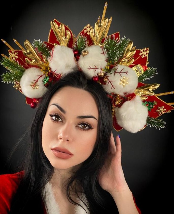 For a bold and dramatic Christmas look, this hairstyle features a large holiday crown adorned with gold antlers, fluffy cotton balls, and Christmas greenery. It’s a perfect fit for anyone who loves to go all out during the holiday season and wants to be the center of attention. This regal crown turns any hairstyle into a festive masterpiece, making it ideal for a formal Christmas party or a holiday gala.