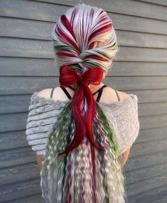 This intricately braided hairstyle blends Christmas colors of red, green, and white, creating a candy cane effect that’s both funky and festive. The braid finishes in a beautifully tied red ribbon bow, perfect for a holiday event or fun party. This style is ideal for those with long hair or hair extensions who want to embrace the holiday spirit in a creative and unique way.