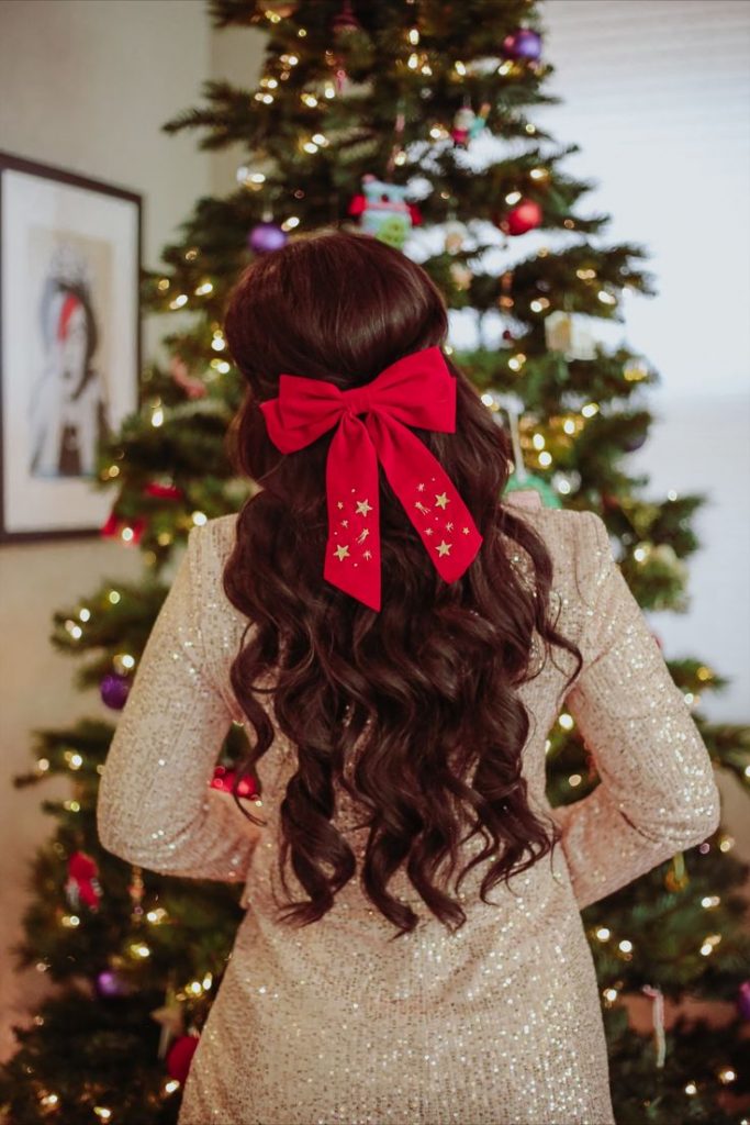 To achieve the perfect waves, use a wide-barrel curling iron and set the curls with a lightweight setting spray. The bow can be attached using an elastic band or clip, ensuring it stays in place throughout the evening. This look is great for Christmas parties where you want to look polished yet festive.