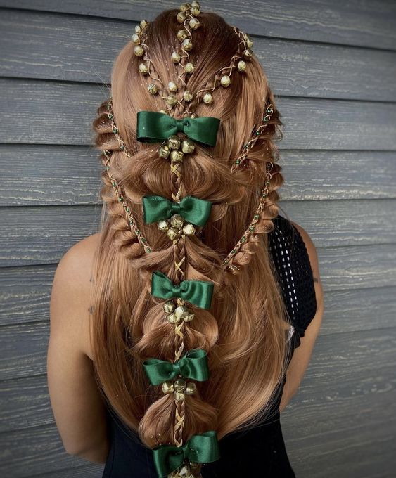 For a creative and fun look, this braided hairstyle incorporates small green bows and bells into the braid, making it ideal for kids or women who love to add a playful touch to their Christmas style. The intricate braiding combined with the delicate accessories creates a festive and joyful hairstyle, perfect for all Christmas occasions.