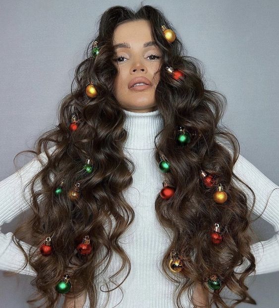 Take holiday hair to the next level with this funky and fun style, where the hair is transformed into a festive display using Christmas ornaments. Long curls provide the perfect canvas for this look, which is ideal for women who love to embrace the Christmas spirit fully. Whether it’s for a party or a fun photoshoot, this hairstyle is sure to turn heads.