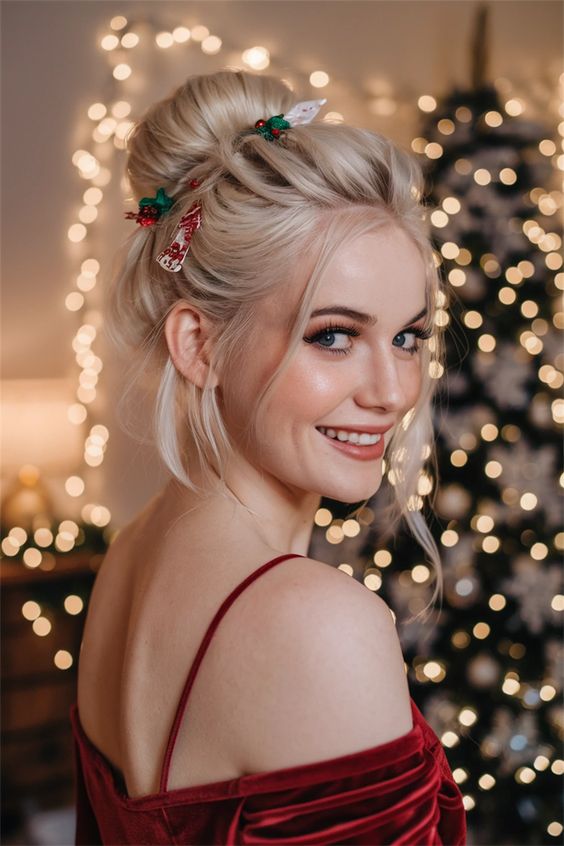 This stunning updo is perfect for a classy Christmas dinner or a formal event. The soft, blonde hair is swept into a voluminous bun, with loose tendrils framing the face for a natural yet polished look. The addition of delicate Christmas-themed ribbons adds a playful touch to this otherwise elegant hairstyle. It’s ideal for women with medium length or long hair, and can easily be replicated with a little teasing at the crown for volume.
