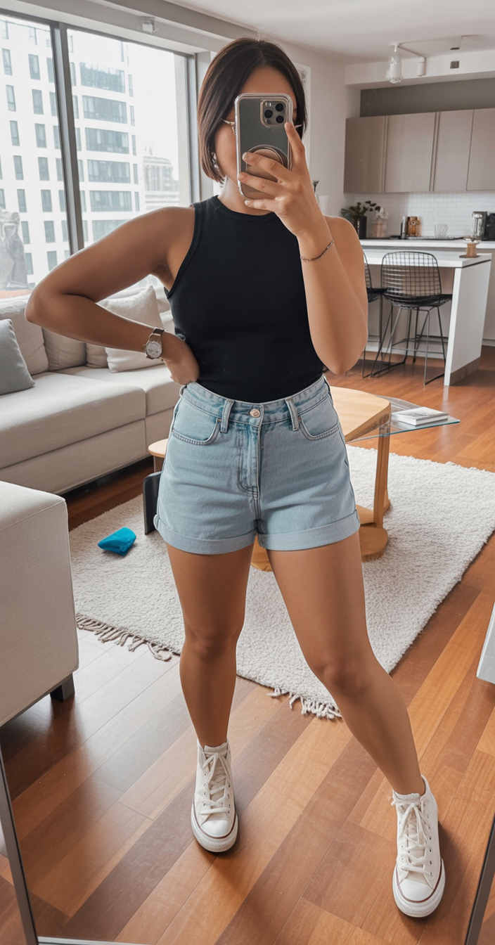 This look feels clean, confident, and timeless. A fitted tank tucked into denim shorts creates a simple silhouette that always works. It’s the kind of outfit that feels familiar in the best way, like an old favorite you trust.