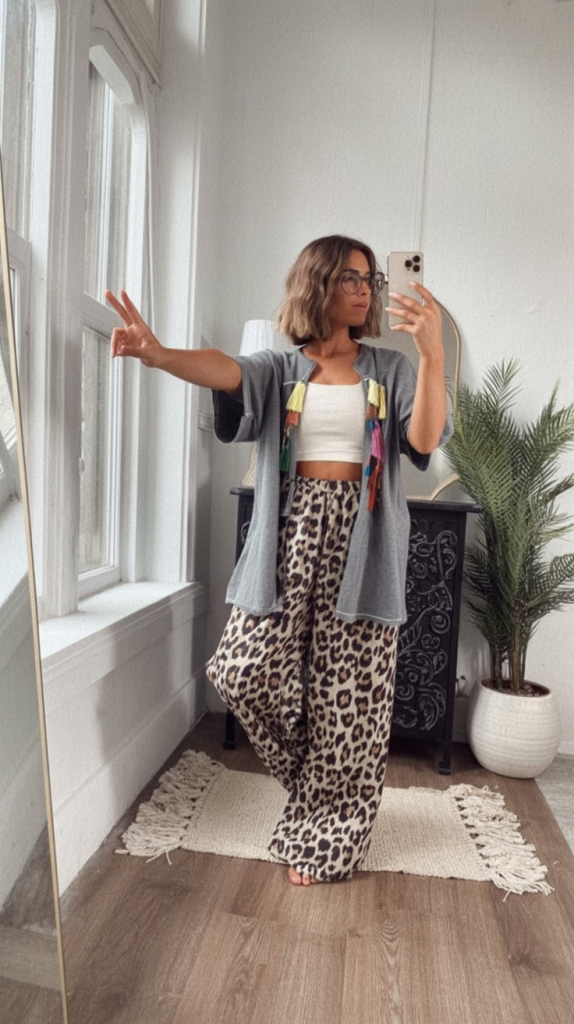 This outfit feels expressive and a little bold, perfect for days when you want your clothes to reflect your mood. The flowy patterned pants bring personality, while the cropped top keeps things fresh and modern. It’s relaxed, artsy, and full of character.
