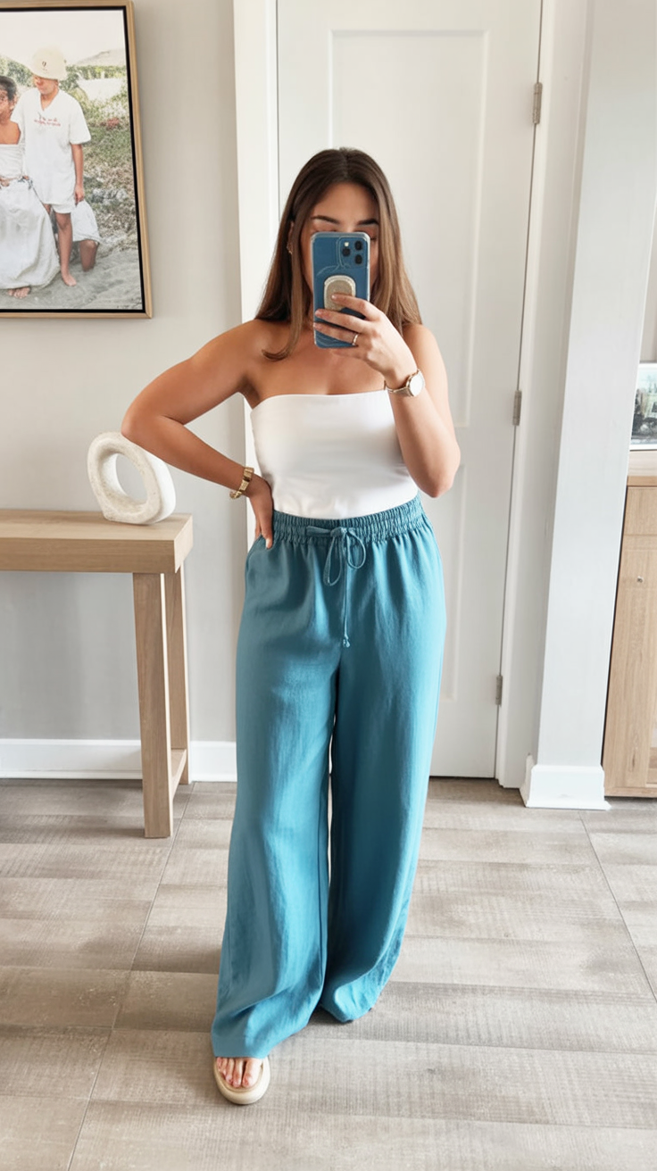 This look feels calm, clean, and quietly confident. The strapless top paired with airy pants gives off that relaxed, grown-woman energy that feels fresh without trying too hard. It’s simple, flattering, and perfect for warm spring days when you want to feel light and free.