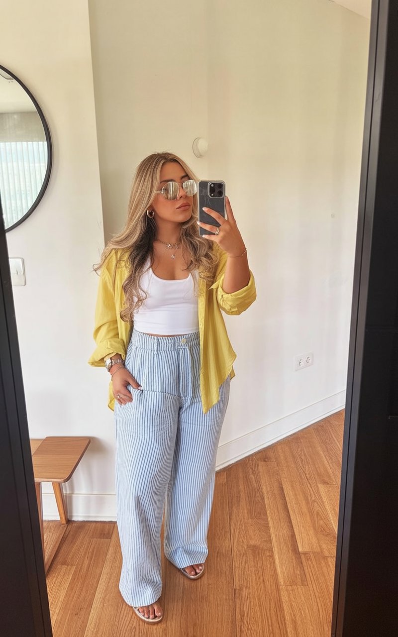 This outfit feels breezy and optimistic, like the kind of day where everything feels just a little easier. The striped pants add visual interest while staying relaxed, and the light layers keep it practical for shifting spring temperatures.