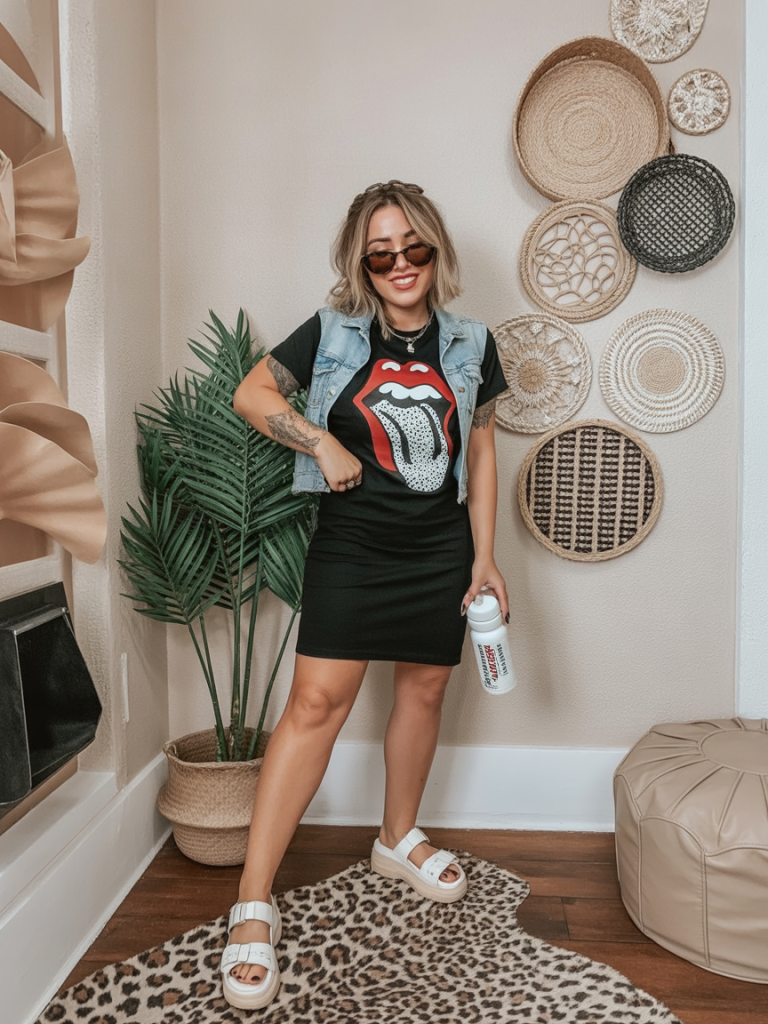 This look gives off effortless confidence with a sporty twist. A relaxed tee dress styled casually feels modern, bold, and incredibly wearable. It’s one of those outfits that instantly makes you feel comfortable in your own skin.