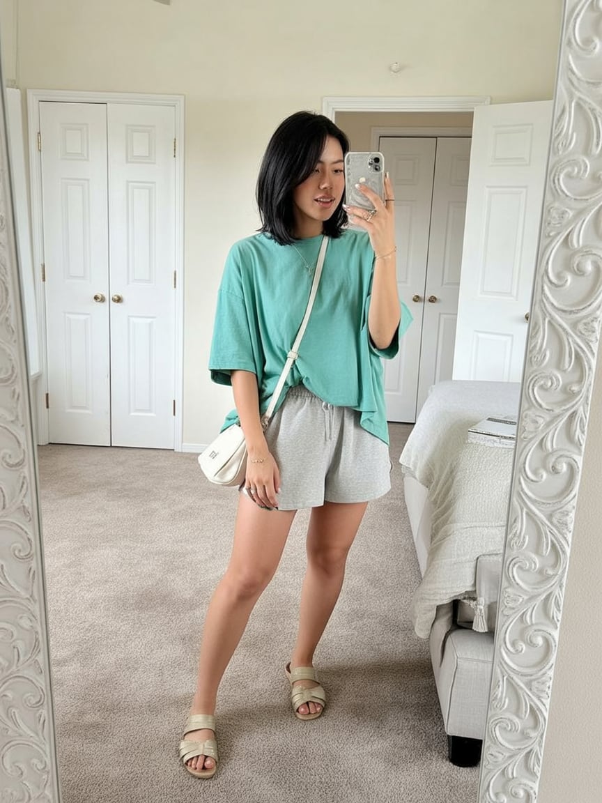 Compared to classic leggings or jeans, this look feels lighter and more fun for spring. The soft shorts keep it breathable, while chunky sandals or sneakers add personality. Great for lazy summer days, casual errands, or when you still want Inspo-worthy style.