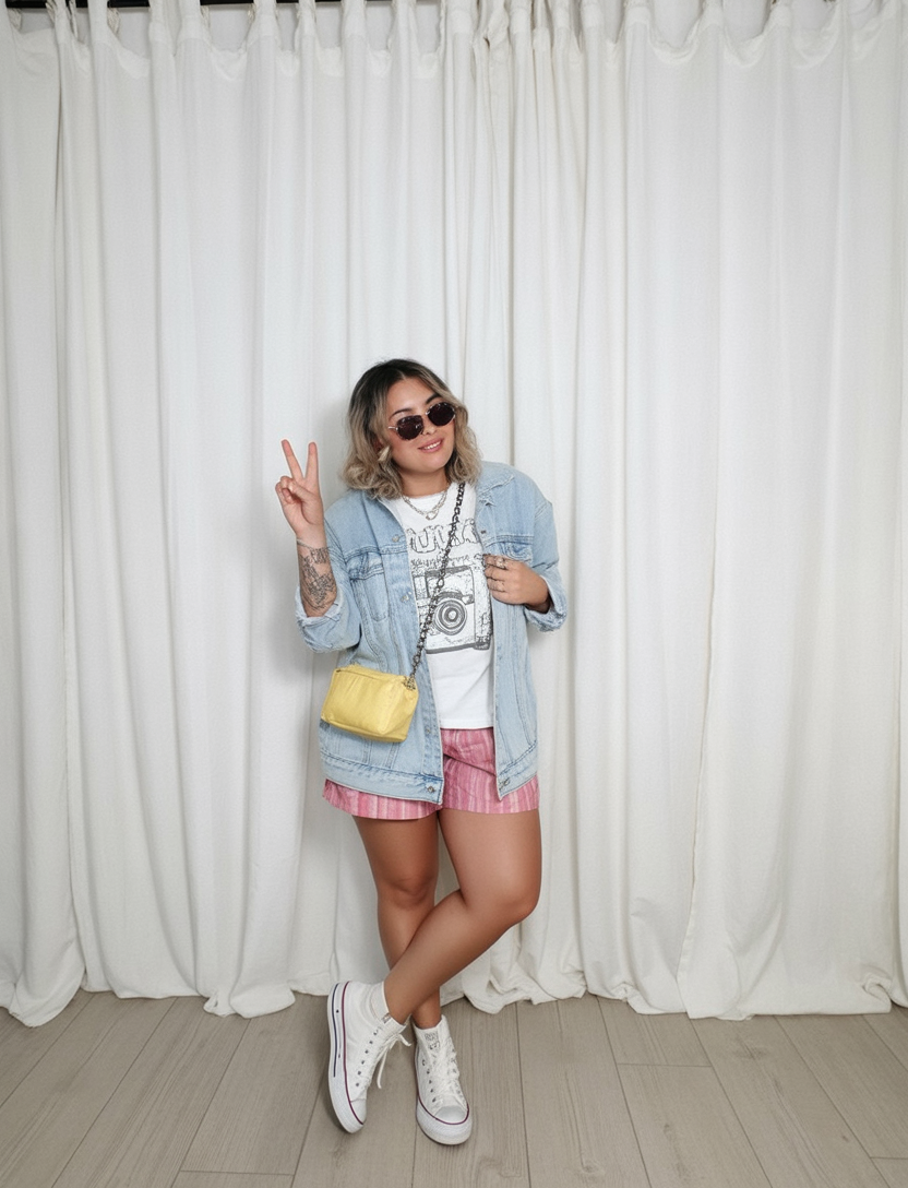 This look has that cool, laid-back charm that never really goes out of style. A denim jacket layered over a simple outfit instantly adds structure, while the shorts keep it playful and easy. It feels youthful, confident, and relaxed all at once.