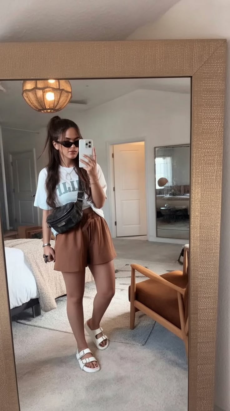This look feels like the perfect blend of lounging and stepping out. Relaxed shorts paired with a loose tee give off effortless lazy energy while still looking intentional. It’s calm, confident, and very now.