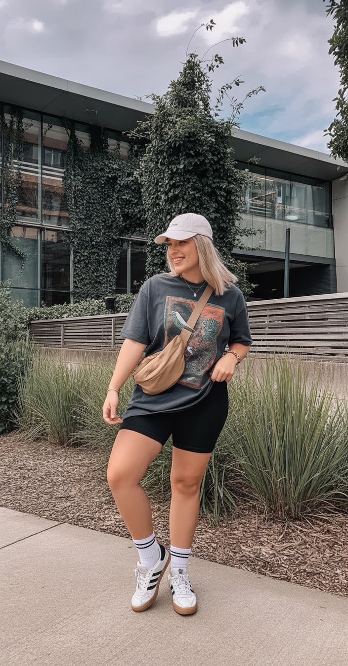 This outfit has that easy, feel-good confidence that comes from knowing you’re comfortable and still look cute. The oversized graphic tee gives a relaxed, slightly nostalgic vibe, while the biker shorts keep things grounded in modern casual looks. It feels playful, effortless, and perfect for days when you want to feel like yourself without overthinking your outfit.