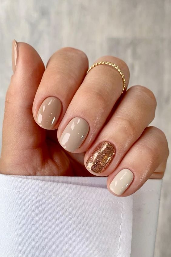 For a more understated look, try this neutral nail design with a hint of sparkle. The nude base color is complemented by a glittery gold accent nail, adding just the right amount of glamour. This simple yet stylish design is perfect for any occasion.