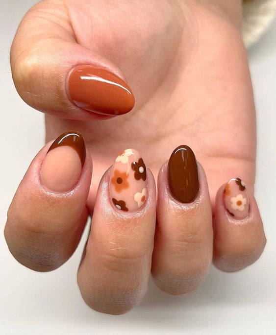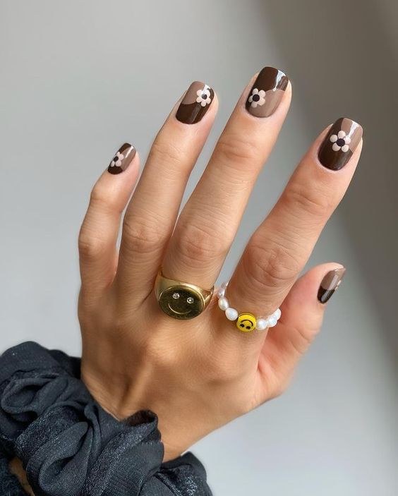 This design combines retro floral patterns with rich shades of brown and nude. The delicate flowers on a neutral base give a vintage vibe that’s both nostalgic and trendy. This cute nail art is perfect for those who love a touch of the past with modern elegance.