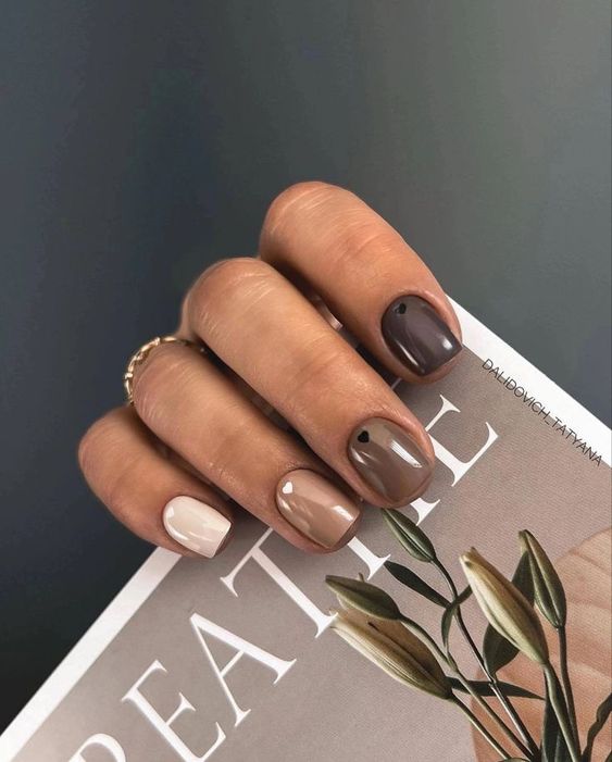 Sophistication meets simplicity with this set of earthy-toned nails. Shades of brown and beige are used creatively, with a minimalist black dot adding a chic detail. This simple and neutral design is ideal for an understated yet stylish look.
