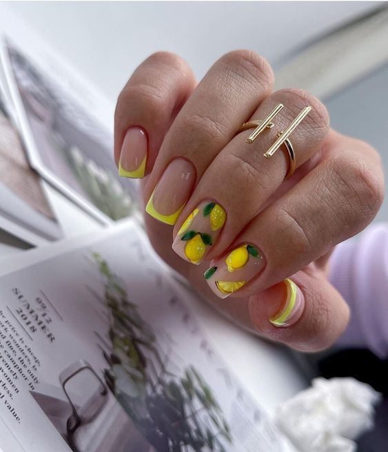 Brighten up your fall with a fresh citrus-inspired nail design. The vibrant yellow and green accents on a nude base create a playful and refreshing look. This easy and cheerful design is perfect for adding a pop of color to your autumn ensemble.