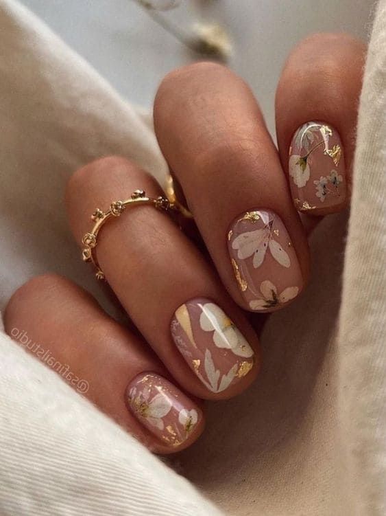 This elegant design features delicate floral patterns on a soft, neutral base, accented with subtle gold flecks. The intricate details add a touch of sophistication, making it perfect for special occasions or everyday wear. This nail design combines simple elegance with intricate artistry.
