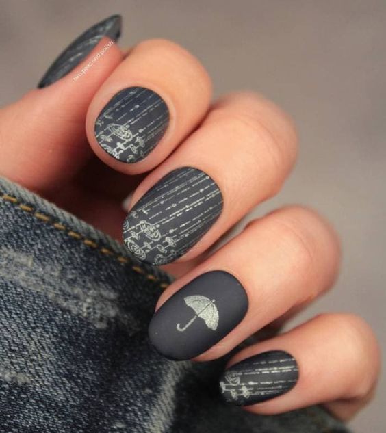 Embrace the cozy feel of a rainy day with this unique design. The matte blue base is adorned with silver rain and umbrella patterns, capturing the essence of autumn showers. This cute and whimsical design is perfect for adding a bit of fun to your fall nails.