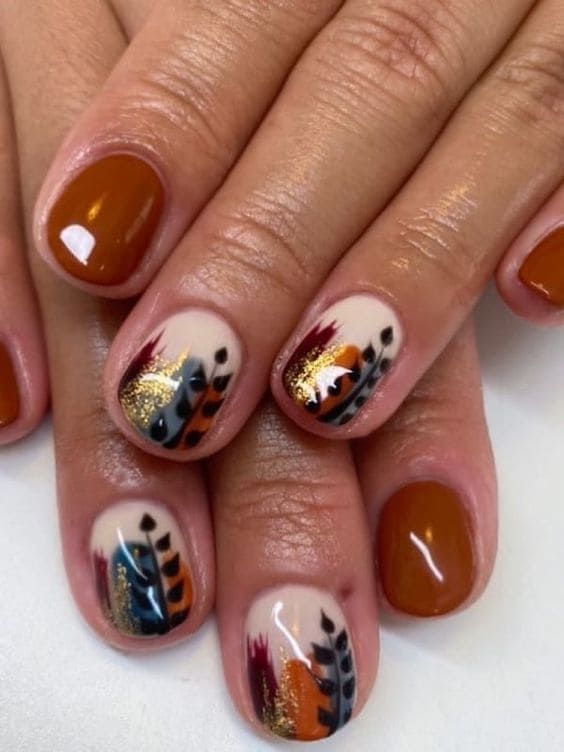 This design features rich brown shades complemented by artistic feather accents. The intricate feather patterns in fall colors add a unique and creative touch. This nail design is ideal for those who love detailed and artistic nail art.