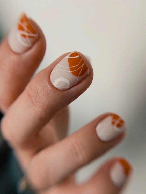 This abstract design features warm autumn colors and modern patterns, creating a unique and eye-catching look. The orange and white swirls on a neutral base are both artistic and trendy, perfect for those who love creative nail designs.