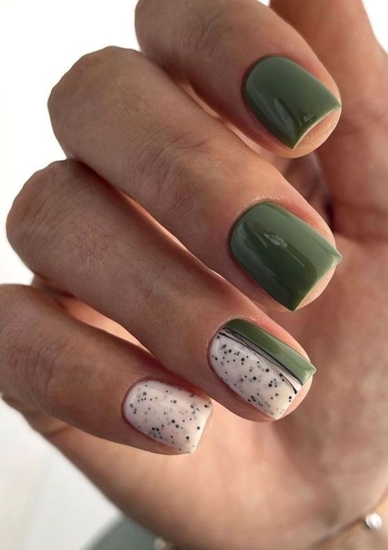 Embrace the colors of fall with a combination of earthy green and speckled white nails. The rich green shade captures the essence of nature, while the speckled white adds a touch of fun and whimsy. This simple yet elegant design is ideal for those who prefer easy and neutral looks.