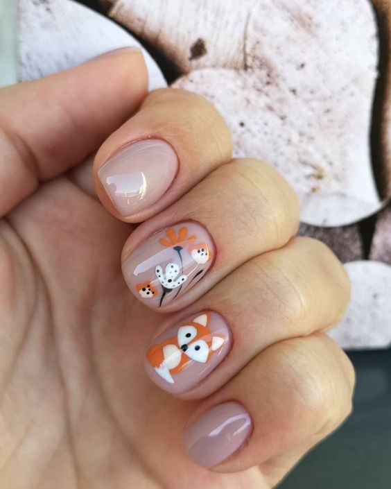 Add a playful touch to your nails with this adorable fox and floral design. The nude base color serves as a perfect canvas for the intricate fox and flower patterns. This cute and whimsical design is perfect for those who love nature-inspired nail designs.