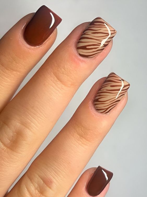 This brown nail design features a blend of solid brown and subtle zebra stripes, perfect for fall. The warm brown tones are complemented by the intricate zebra patterns, making it an excellent choice for those who want a sophisticated yet trendy look.