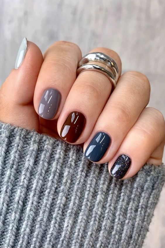 Combine various autumn shades like gray, brown, and blue to create a cozy and stylish nail design. Each nail features a different color, adding depth and interest to the overall look. This design is perfect for those who want to experiment with 2024 trends in nail colors.