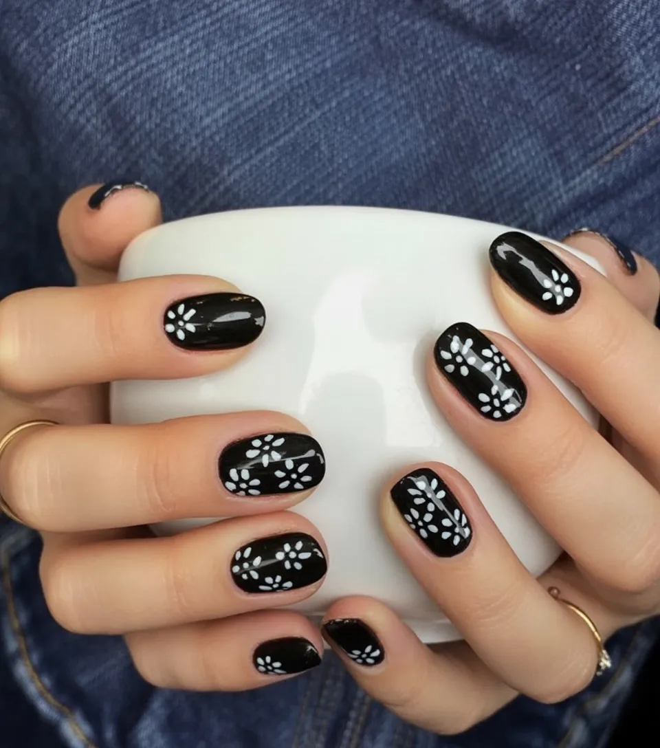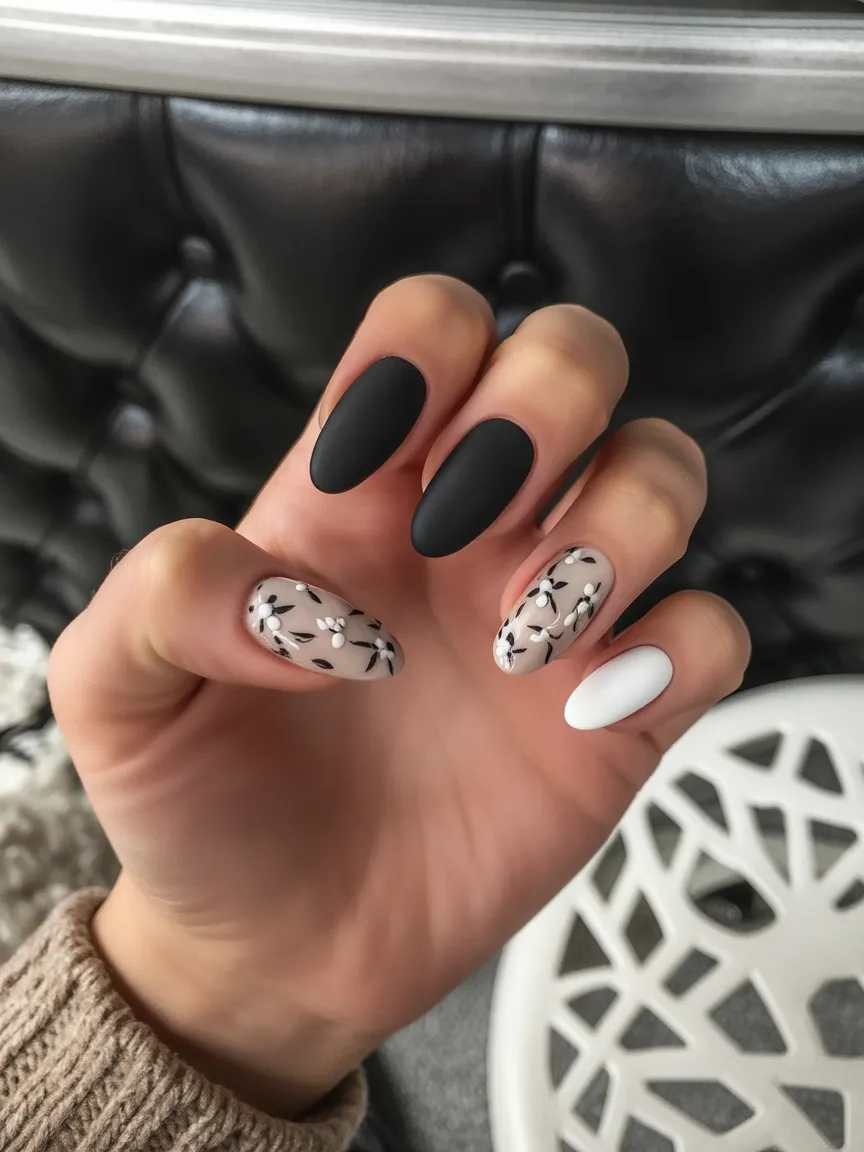 This manicure feels modern, calm, and a little architectural. The matte black nails create a strong base, while the soft botanical accents in white balance everything out. It’s moody without being heavy, and the neutral palette makes it incredibly versatile.