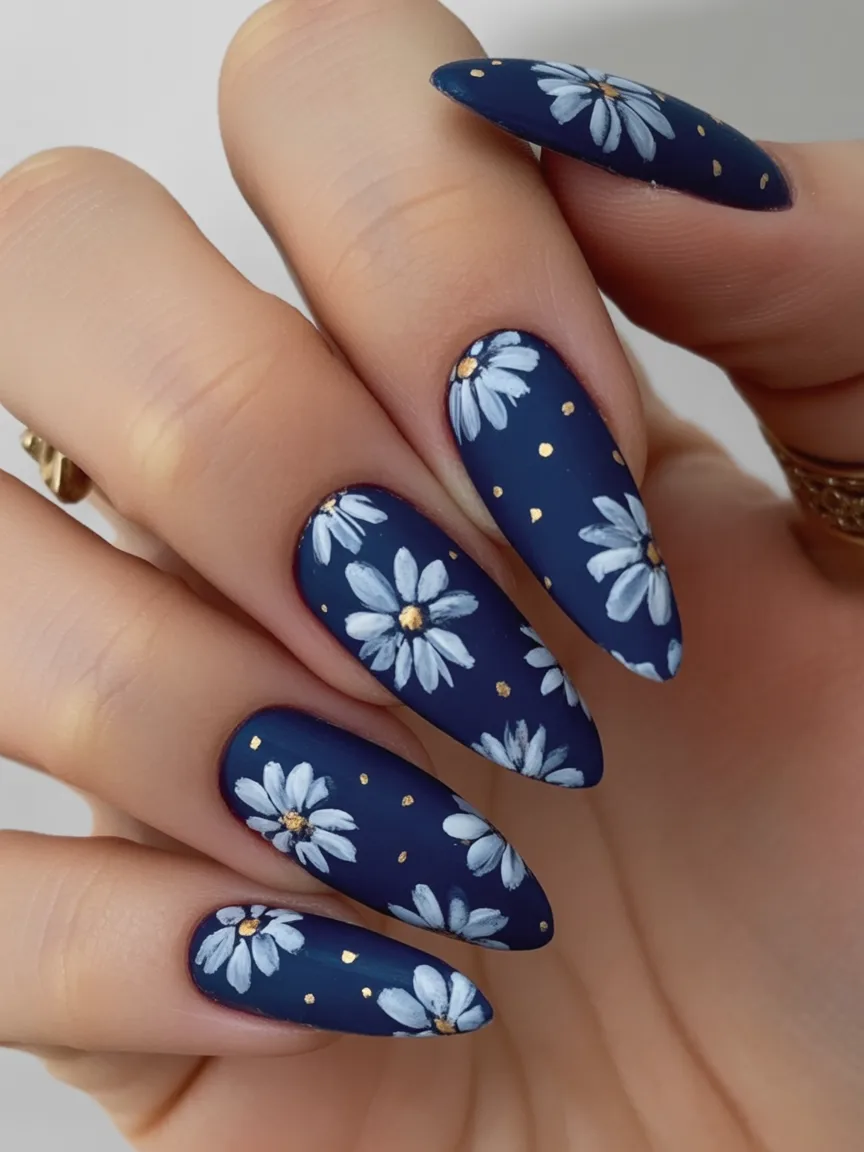 This look feels like the perfect closing note for dark spring nails—rich navy, soft white florals, and tiny hints of gold. It’s elegant, cozy, and quietly luxurious, like your favorite sweater paired with a great piece of jewelry. The matte finish adds depth and sophistication.