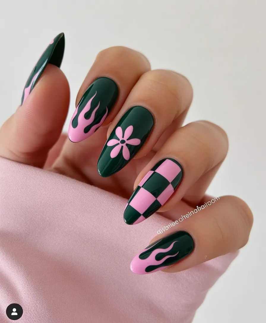 This set feels artistic and unexpected, mixing deep green with soft pink in bold, graphic ways. It has a modern, almost editorial feel while still being playful. The mix of patterns keeps the eye moving and makes the nails feel expressive, like wearable art rather than just a manicure.