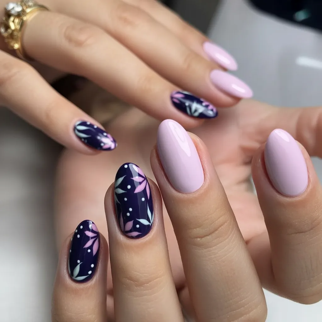 This set feels like a conversation between softness and depth. Pale pink nails bring a calm, clean energy, while the dark floral accents ground the look and make it feel intentional. It’s fresh but not overly sweet, perfect for someone who loves subtle contrast. The overall vibe is polished, feminine, and quietly confident—exactly the kind of balance dark spring nails are leaning into for 2026 ideas.