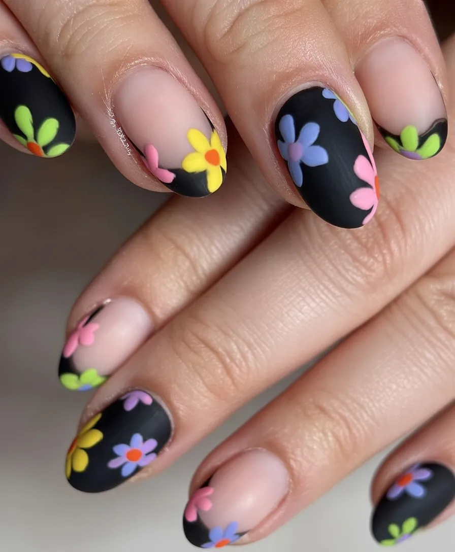 Matte black nails instantly set a confident tone, but the colorful floral tips soften the mood in the best way. This look feels artistic and modern, like someone who appreciates creativity but still wants structure. It’s playful without losing its edge, giving off that cool, put-together energy that works just as well for weekends as it does for busy weekdays.