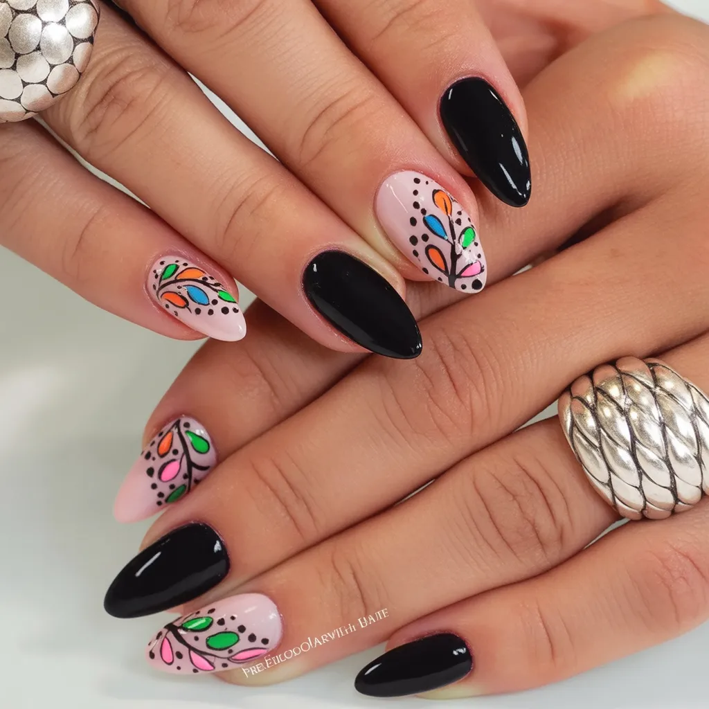 This design feels artistic and thoughtful, like tiny modern paintings on your fingertips. The black base keeps everything sleek, while the blush accent nails with colorful leaf-like Art bring in that fresh spring energy. It’s dark but not heavy—creative without feeling chaotic.