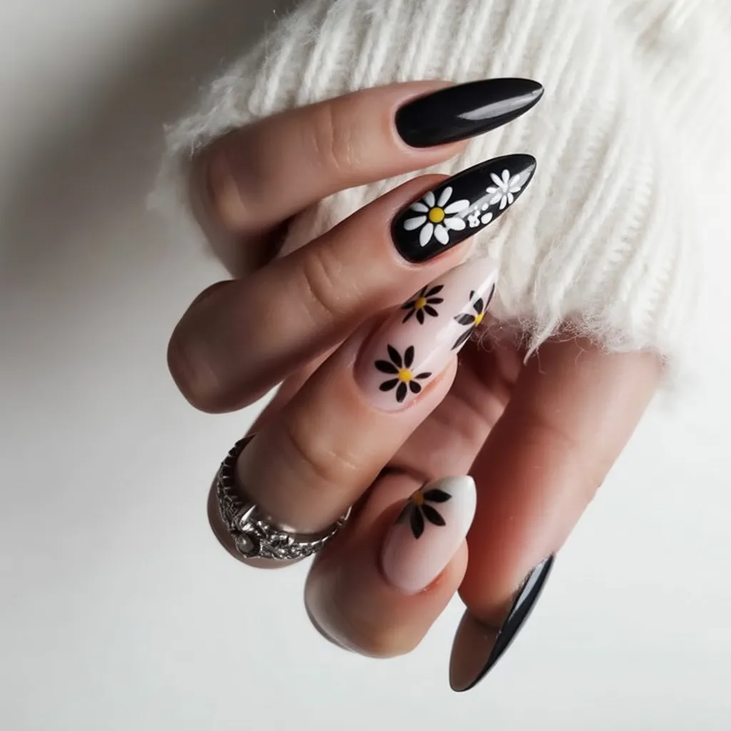 This look feels like the perfect balance of soft and strong. Jet black nails sit next to blush-toned bases with crisp daisy Art, creating a contrast that feels modern and intentional. It’s feminine but grounded, playful but grown-up—exactly the kind of dark spring nails Inspo we’re seeing everywhere for 2026.