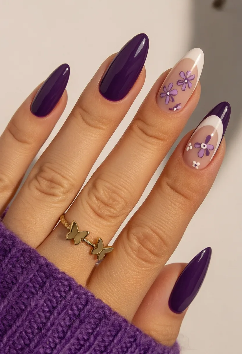 This is a softer take on dark spring nails, blending classic French tips with rich purple tones and tiny floral accents. It feels elegant, feminine, and very wearable—like a quiet upgrade to a traditional look. There’s a calm confidence here that feels timeless rather than trendy.