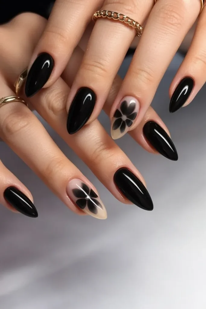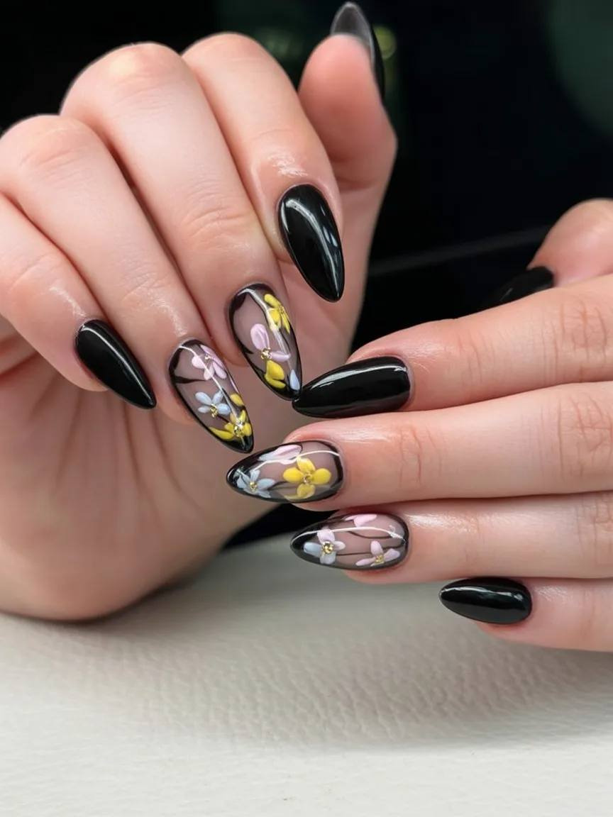 If you love almond shapes and want something that feels elevated for 2026, this design hits the mark. The contrast between Solid black and floral Designs keeps it interesting, and Gel Polish will give you that glassy finish that makes the details pop. It’s perfect for date nights, events, or honestly just feeling a little extra on a Tuesday.