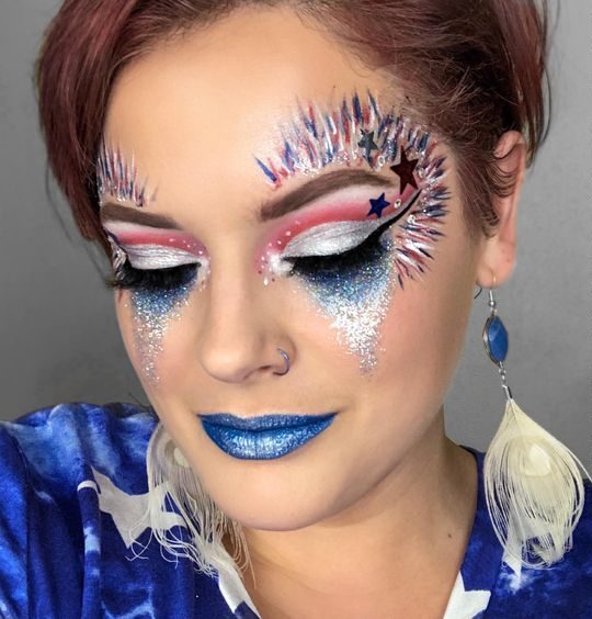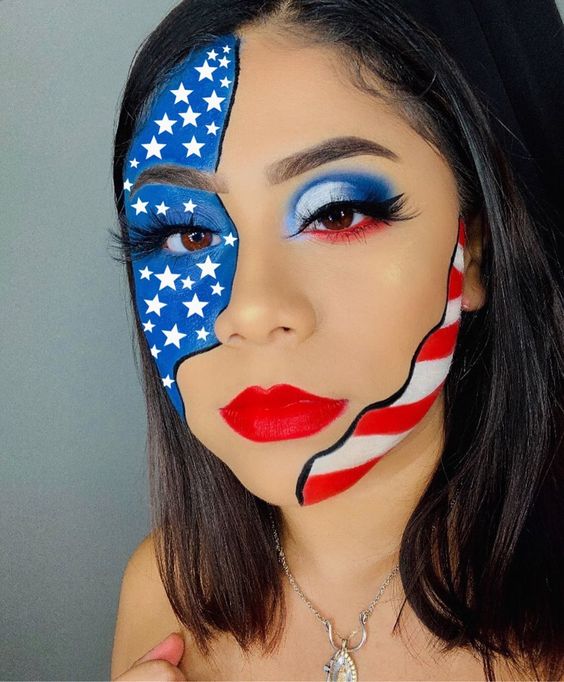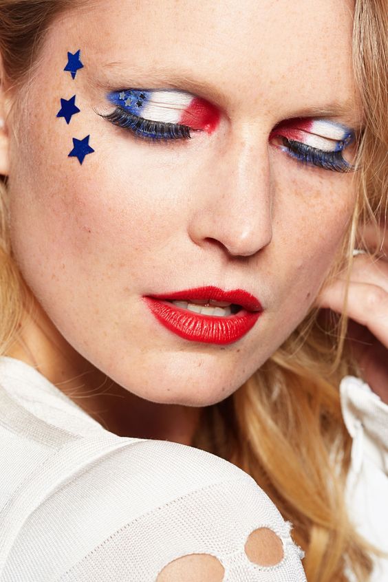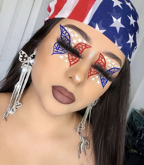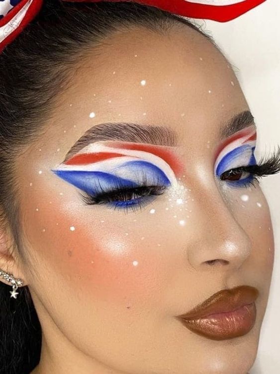 Bold and graphic, this makeup idea transforms the eyebrows into a canvas for patriotism. With red and blue eyeshadow creating an avant-garde flag motif, and white stars accentuating the look, it’s a simple yet bold statement that’s sure to turn heads.