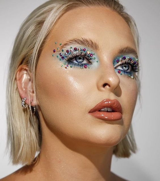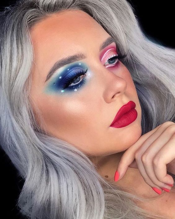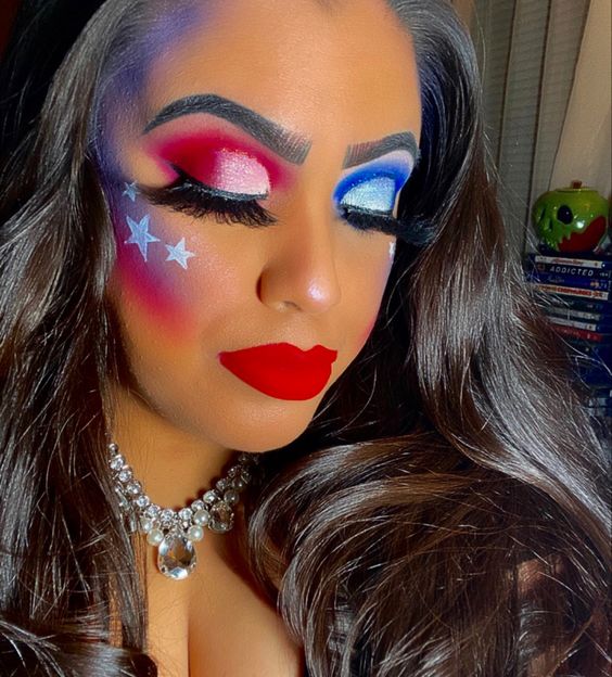 This makeup idea takes inspiration from classic pop art. Bright colors, bold lines, and star patterns come together to create a dynamic and playful look that turns the face into a canvas celebrating American pop culture.