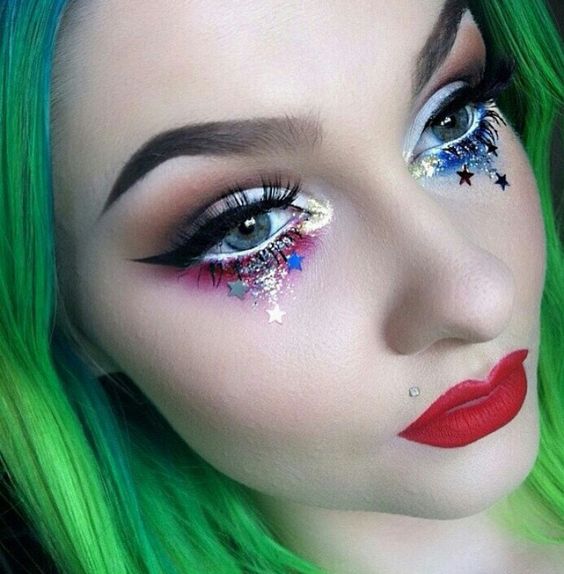 Who says you have to stick to the traditional palette? This look adds a twist with a vibrant green, complementing the customary red, white, and blue for a unique and edgy interpretation of 4th of July makeup. This idea is perfect for those wanting to stand out in a crowd.