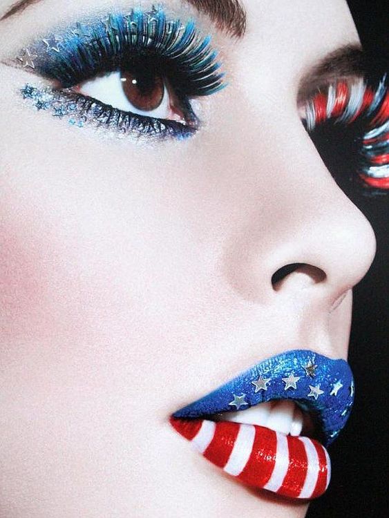 Amp up the drama with lashes painted in the colors of the flag. The bold use of blue and red on the lashes against a stark white eyeshadow base makes the eyes pop in a simple yet striking manner.