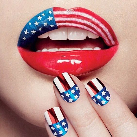 Don’t forget your nails in your 4th of July makeup and style routine. This look involves painting your nails with stripes and stars to match your lips, creating a cohesive and fun mood for the occasion.