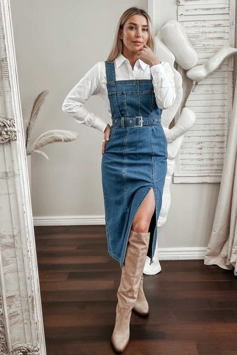 This belted denim midi dress is for the days when you want to feel completely put together with minimal effort. The fitted bodice, pencil skirt, and front slit create a long, lean line, while the crisp white shirt underneath adds a hint of office polish. Paired with neutral boots, it becomes a powerful yet wearable look that works just as well for client meetings as it does for a dinner reservation. It’s the kind of outfit that quietly says you know exactly what you’re doing.