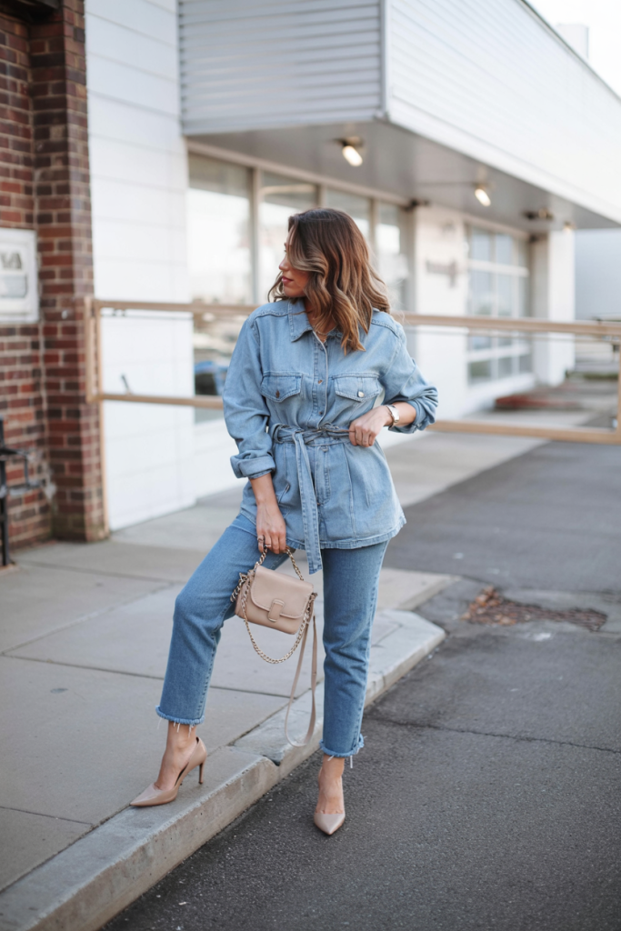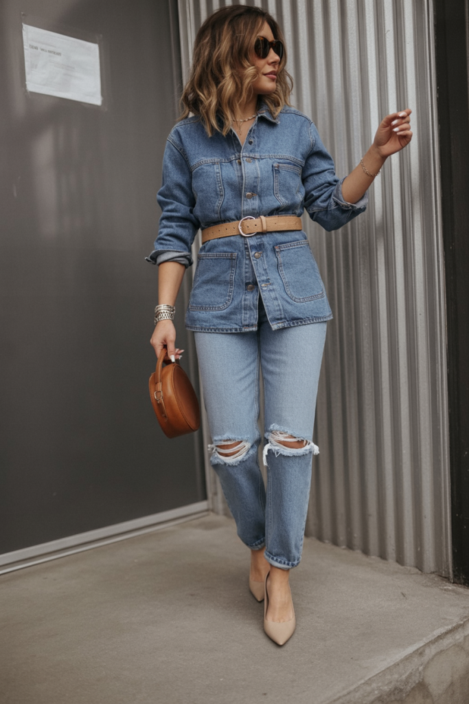 This outfit is proof that double denim can feel chic, not like a costume. The structured denim jacket, belted at the waist, teams up with gently ripped jeans for a look that feels modern and wearable. Nude heels and a round tan bag soften everything and keep it grown-up, making this perfect for women who live in jeans but want something a little more elevated than the usual tee-and-denim uniform.