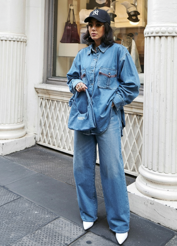 This outfit is for the days when you want to disappear into comfort but still look like you belong in a street-style photoshoot. The oversized denim shirt, roomy jeans, and baseball cap create that effortless casual street-style vibe that says you know what’s trending but you’re not trying too hard. The blue-on-blue layers feel cool and relaxed, and the white pointed shoes add just the right bit of sharpness so the look never turns sloppy.