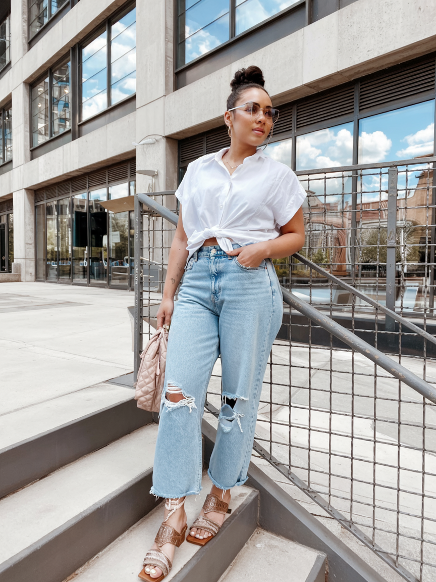 This look is the definition of casual street style that still feels grown and polished. The relaxed light-wash jeans with rips at the knees give just enough attitude, while the crisp knotted shirt keeps everything clean and fresh. It’s the kind of outfit you throw on for a busy summer Saturday and end up getting compliments on all day—from the grocery store to rooftop drinks. The overall vibe says, “I’m comfortable, but I still have places to be,” which is exactly where so many of us are in 2026.