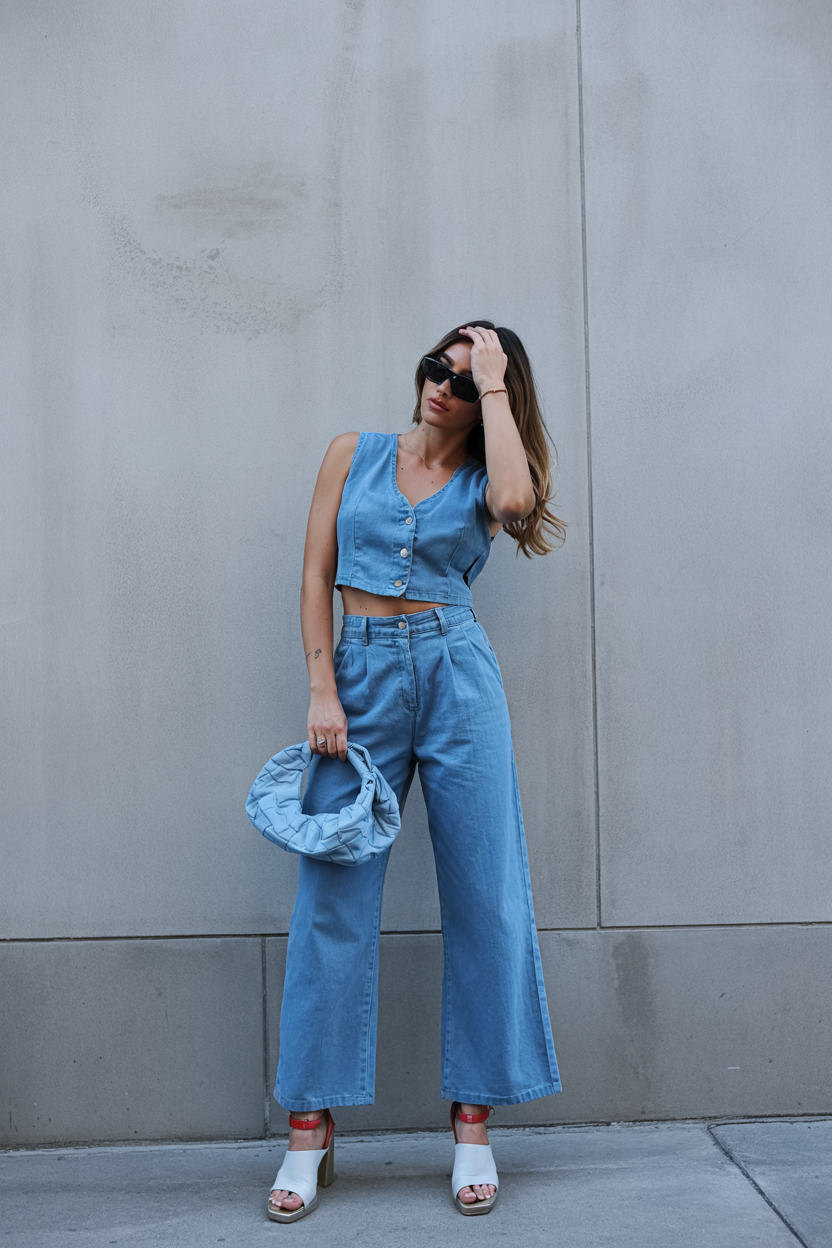 This matching denim co-ord set proves that minimalism doesn’t have to be boring. The cropped buttoned vest and wide, flowing trousers create a long column of color that feels chic, modern, and surprisingly comfortable. Paired with platform sandals and a soft circular bag, the whole look feels like a fresh take on 90s tailoring—clean lines, strong shapes, but still easy enough for a warm summer evening out.