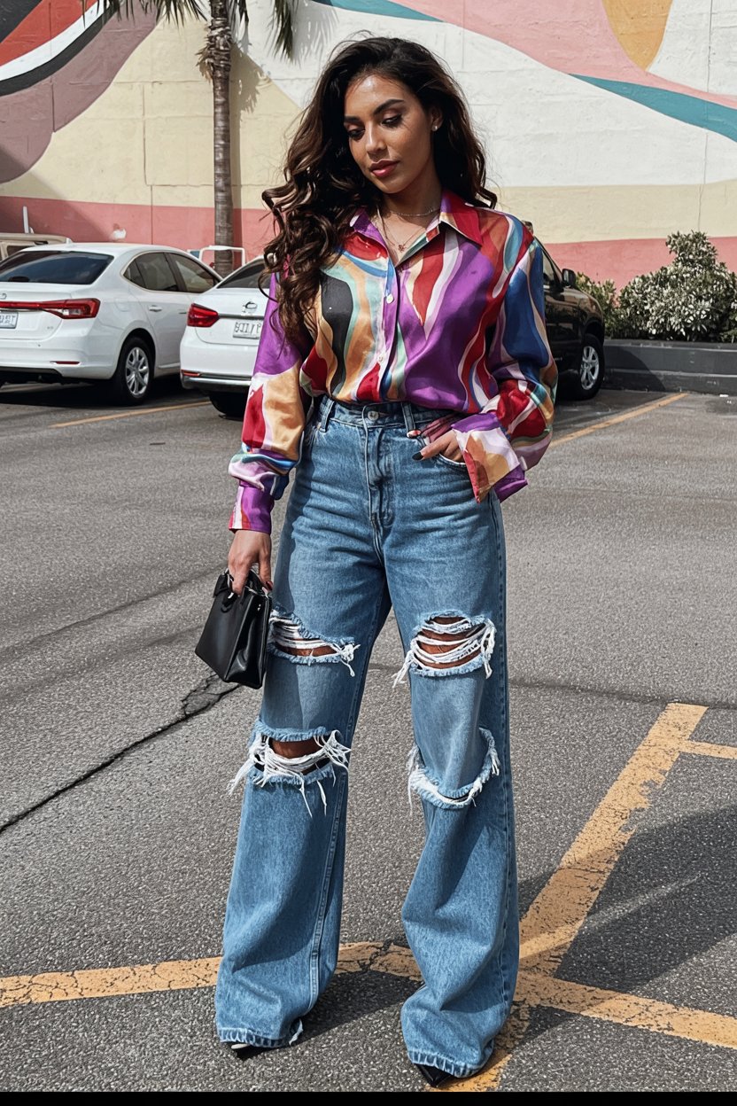 6. Bold Shirt And Wide-Leg Ripped Jeans