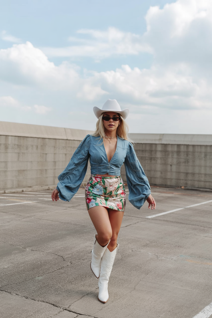 If you’re ready to flirt with your inner cowgirl without giving up your city edge, this look is for you. The structured denim top with dramatic sleeves balances beautifully against the bright printed mini skirt and white boots, creating a fun clash of textures and moods. It’s giving rooftop cocktails, live music, and that feeling of being fully in your main-character era. This is exactly where Y2K denim looks are heading in 2026—less costume and more confident mash-ups of denim and bold color.