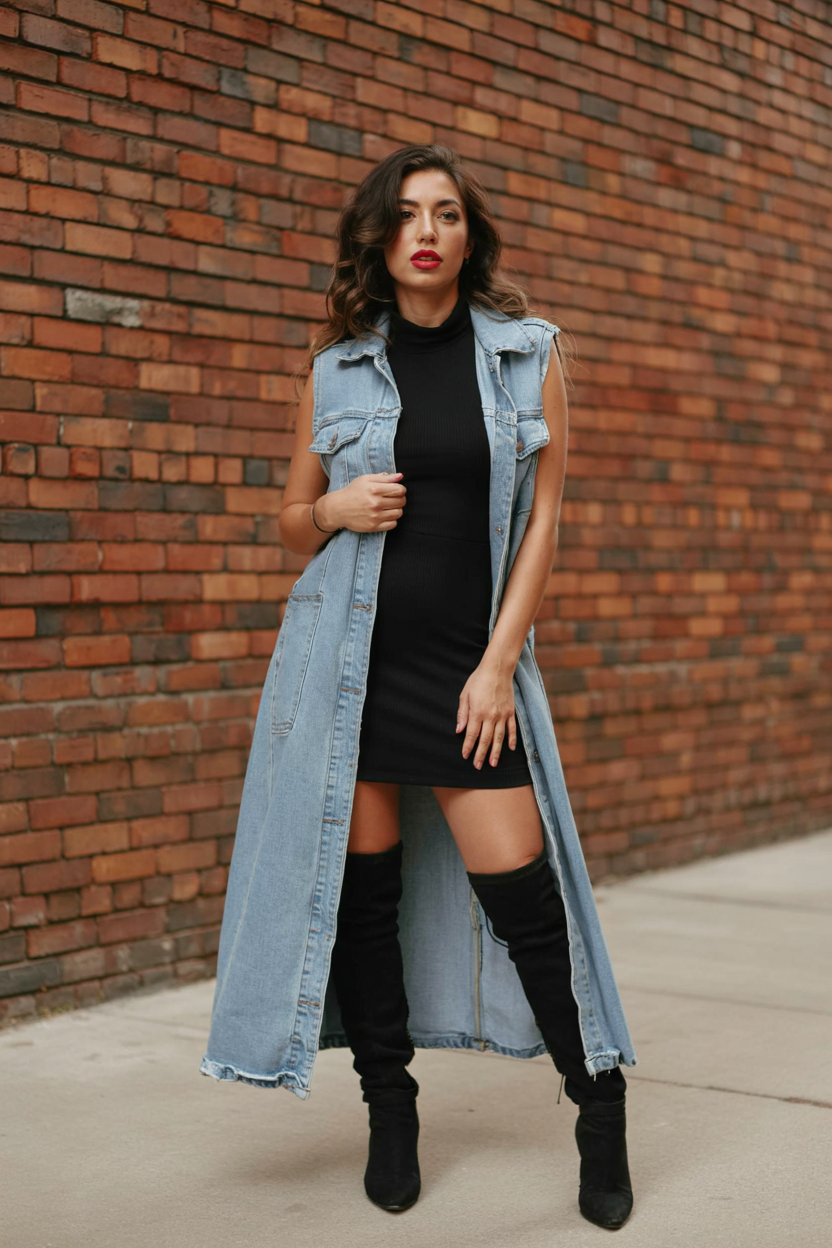 This look is pure power with a wink. A sleek black dress paired with a sweeping light-wash denim vest and over-the-knee boots creates a beautiful mix of softness and strength. The long vest moves as you walk, almost like a casual cape, and instantly adds interest to even the simplest base dress. It’s the kind of outfit that turns a brick wall into a backdrop and makes you feel ready for anything—from date night to a downtown gallery opening.