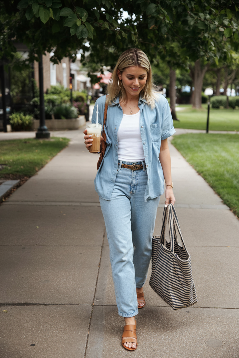 There’s something so comforting about a light blue denim shirt worn open over matching jeans—it feels like wearing your favorite weekend mood. Paired with a simple white tank, tan slides, and a big tote, this outfit is perfect for that first iced coffee of the day and a slow walk through the neighborhood. It’s relaxed, modern, and quietly confident, the kind of look that works just as well in your 20s as it does in your 50s without ever feeling like you’re trying to chase a trend.